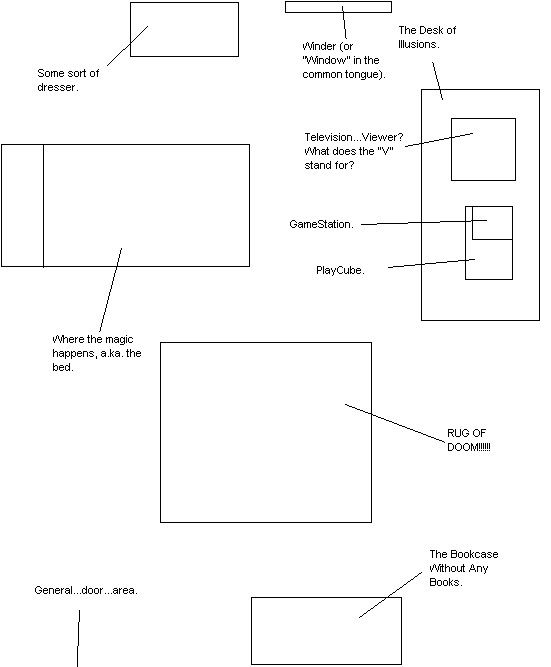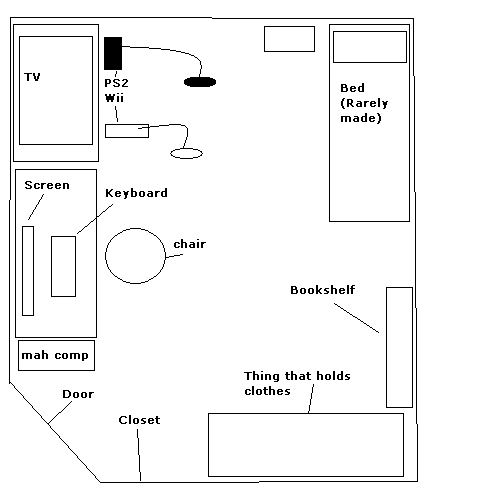 Here's a map of my room. (It's very crappy... it prolly looks worse in real lol. Btw Shishou, you need to get a REAL pic of your room! If ya do asap den I'll give ya a cookie and milk lol)