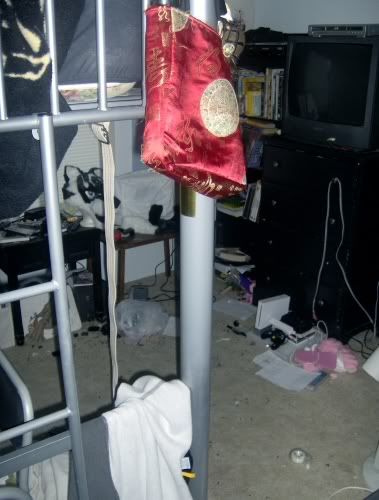 There's a desk to the lefthand side of my bed, the bed's against the wall, and the Desk is against the wall with the window... then there's a long dresser that's against the wall parallel to the bed, in the corner between the dresser and desk, I have the trash can, and usually there's a lot of trash around that area... On my dresser, I usually have my GC, TV, and DVD-VCR... with my games and stuff stacked near the GC. To the right of the dresser is the closet, and that place is usually a mess. then we go back to the door, face the bookshelf again, and we see to the left there's a blue storage box... with a whole lot of old crappy books.