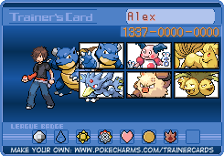 Show us your trainer cards, http://www.pokecharms.com/trainercards, mine is in my signature.  And please make it real, also tell what game it is from.